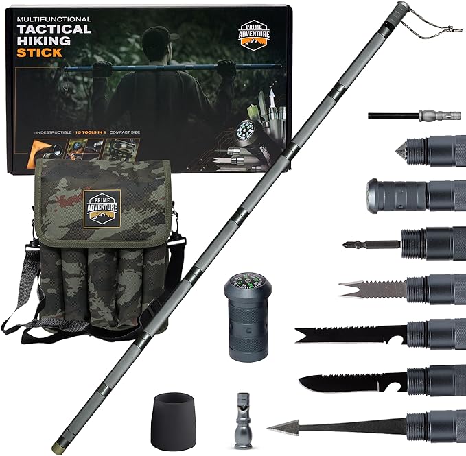 15-in-1 Tactical Survival Walking Stick & Hiking Staff – Heavy-Duty Collapsible Multitool for Camping, Hiking & Outdoor Survival Gear (8 Tubes, Premium Build)