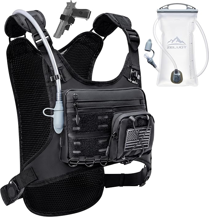 • Plenty of Storage – This chest bag features 3 waterproof zippered front pockets to securely hold essentials like your phone, keys, and energy gels. A detachable, bounce-free pistol holster ensures secure storage for small to mid-sized pistols, while the tactical pen slot keeps emergency gadgets within easy reach. Two large back pockets fit a water bladder, towel, extra clothing